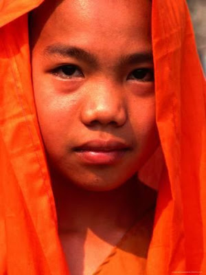 túnica naranja de novicio y su cabeza rapada parecían redondear su candidez. A